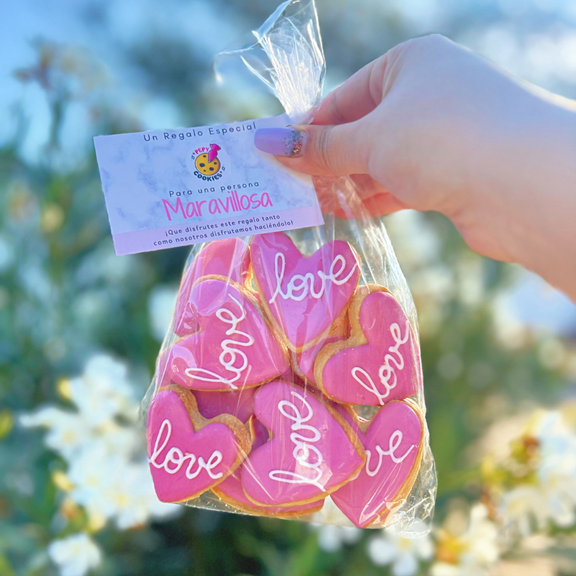 BOLSA 12 MINI GALLETAS CORAZONES LOVE ROSADOS